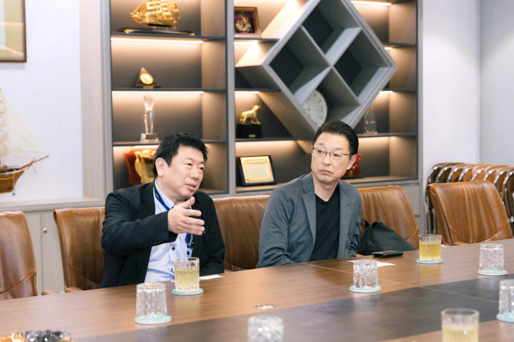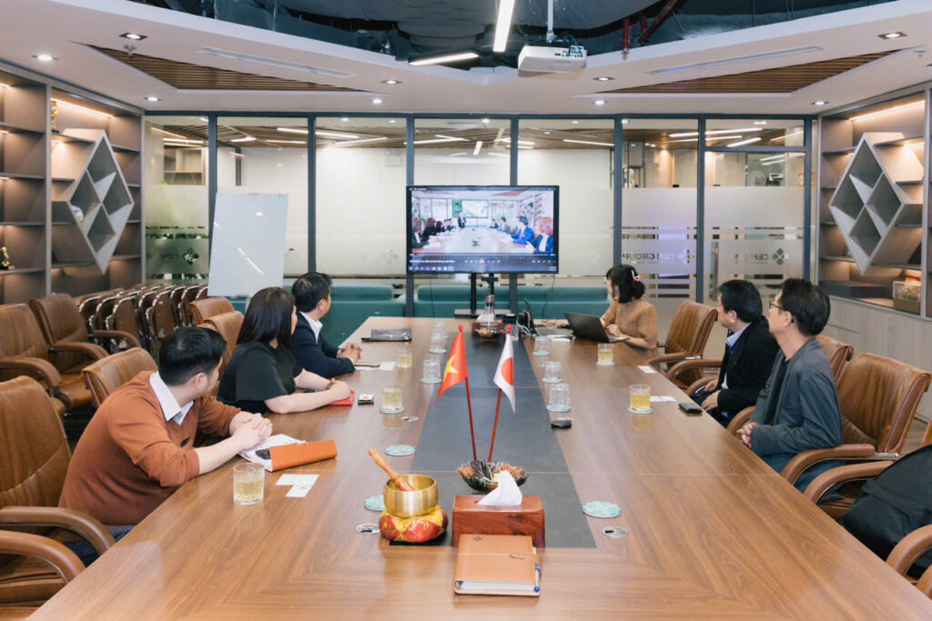 Trong khuôn khổ buổi gặp gỡ, ban lãnh đạo Thanh Bình SMD đã có buổi thảo luận chuyên sâu với đối tác Nhật Bản, tập trung vào các nội dung hợp tác chiến lược dài hạn. Các nội dung chính bao gồm việc trao đổi nguồn nhân lực chất lượng cao, chia sẻ kinh nghiệm trong lĩnh vực kỹ thuật và công nghệ, cũng như thúc đẩy các dự án phát triển bền vững giữa hai quốc gia. Không khí buổi làm việc diễn ra trong tinh thần cởi mở, chuyên nghiệp, với sự hiện diện của các biểu tượng hợp tác như quốc kỳ Việt Nam và Nhật Bản, thể hiện sự gắn kết chặt chẽ giữa hai bên.